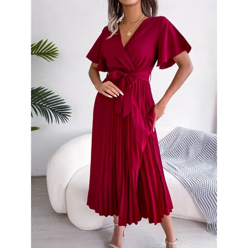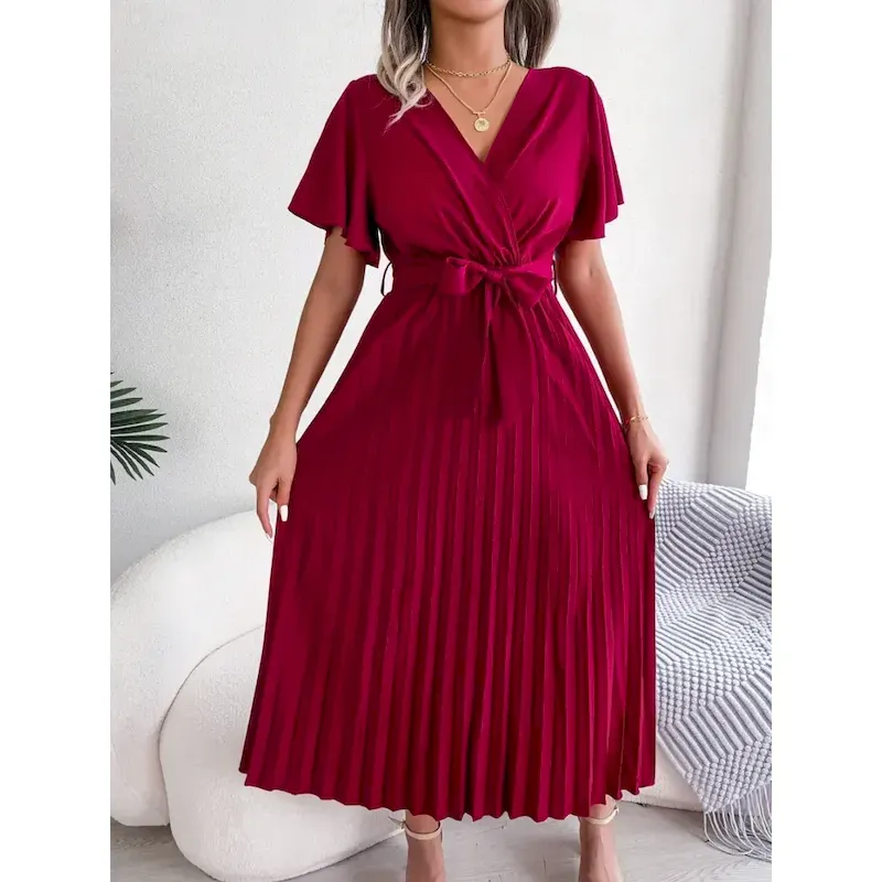 Womens-Midi-Dress-Casual-Dress-A-Line-Dress-Stylish-Basic-Casual-Vacation-Daily-Regular-Fit-Plain-Short-Sleeve-V-Neck-Red-Green-Summer-Spring-2025