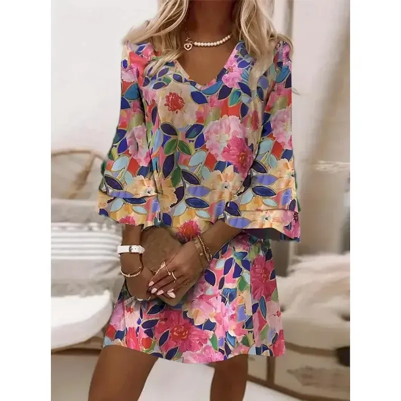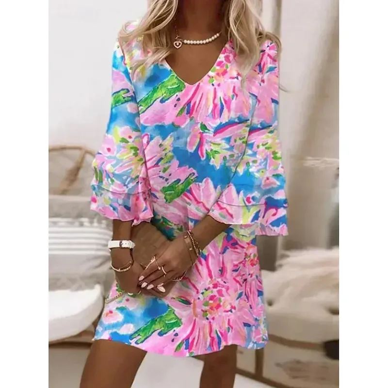 Womens-Mini-Dress-Sundress-A-Line-Dress-Boho-Party-Regular-Fit-Floral-Graphic-34-Length-Sleeve-V-Neck-Light-Pink-Light-Green-Dark-Pink-Sky-Blue-Summ
