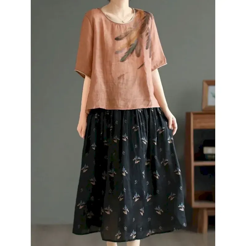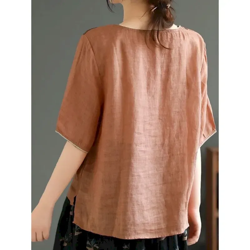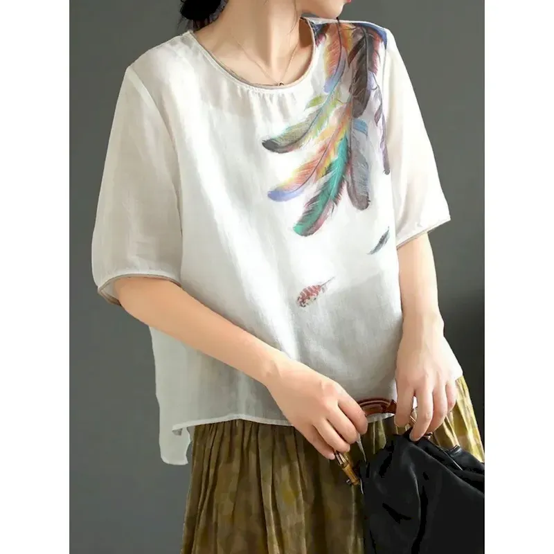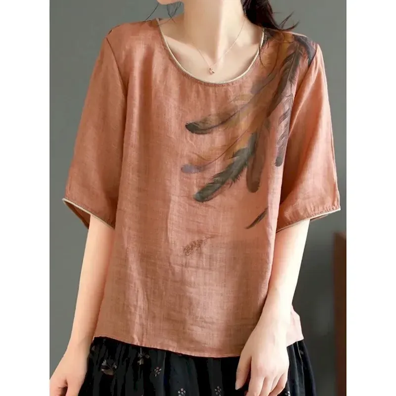 Womens-Shirt-Blouse-Cotton-Linen-Shirts-Feather-Basic-Casual-Half-Sleeve-Crew-Neck-Regular-Tops-Daily-Print-White-Pink-Green-Khaki-Summer-Spring-2025