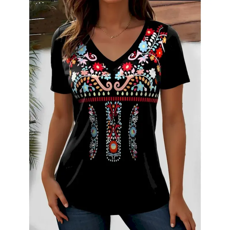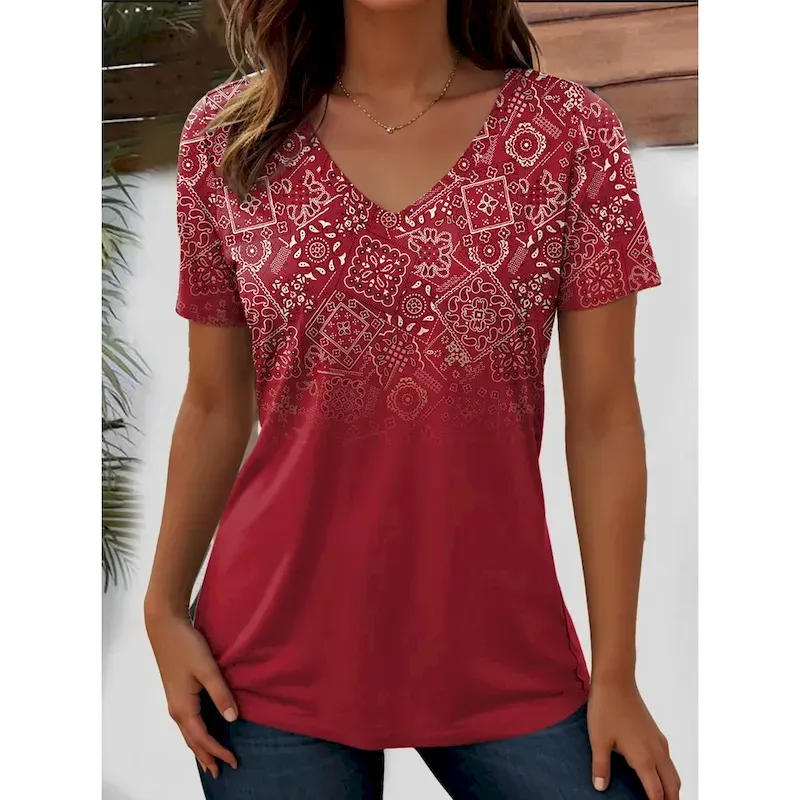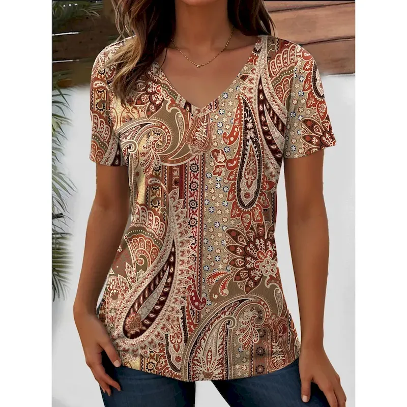 Womens-T-Shirt-Graphic-Paisley-Bohemia-Stylish-Casual-Short-Sleeve-V-Neck-Regular-Tops-Daily-Weekend-Beach-Wear-Print-White--Black-Black-Red-Light-B