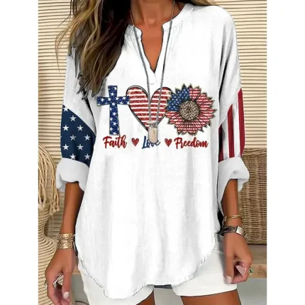 Women’s Blouse Tunic V Neck Long Sleeve Boho Casual Patriotic Graphic Flag Vintage Stylish Regular Tops Daily White 2025